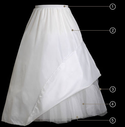 - A nylon taffeta outer layer to protect the interior of the gown. We use an extra soft taffeta to avoid the "crunchy" feel of lesser crinolines. Outer layer is hemmed with lace for an extra touch of elegance.